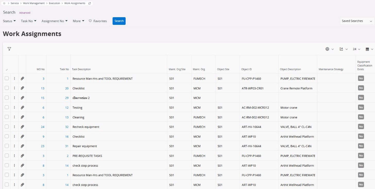 Users can select Work Task Templates or standardized repair work sets to apply to created Work Orders, enabling the system to automatically generate Work Tasks and Work Assignments. For Work Orders created from PM Action plans, the PM Action triggers from various plan patterns. When PM Actions are linked to Work Task Templates, the system retrieves this information to display in Work Orders and Work Tasks.