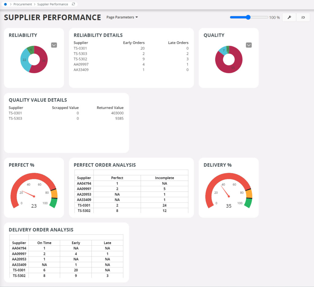 Supplier Performance จากหน้าจอนี้สามารถเลือกตาม Supplier เพื่อวิเคราะห์การทำงานของซัพพลายเออร์แต่ละราย รวมถึงข้อมูลในห่วงโซ่อุปทาน ตั้งแต่ต้นทางจนถึงปลายทางสามารถทำงานเชื่อมต่อกันได้อย่างมีประสิทธิภาพ โดยมีวัตถุประสงค์ในการลดต้นทุนการดำเนินธุรกิจ และเพิ่มประสิทธิภาพการส่งมอบสินค้าและบริการให้กับลูกค้า เพื่อสร้างความพึงพอใจให้กับลูกค้า