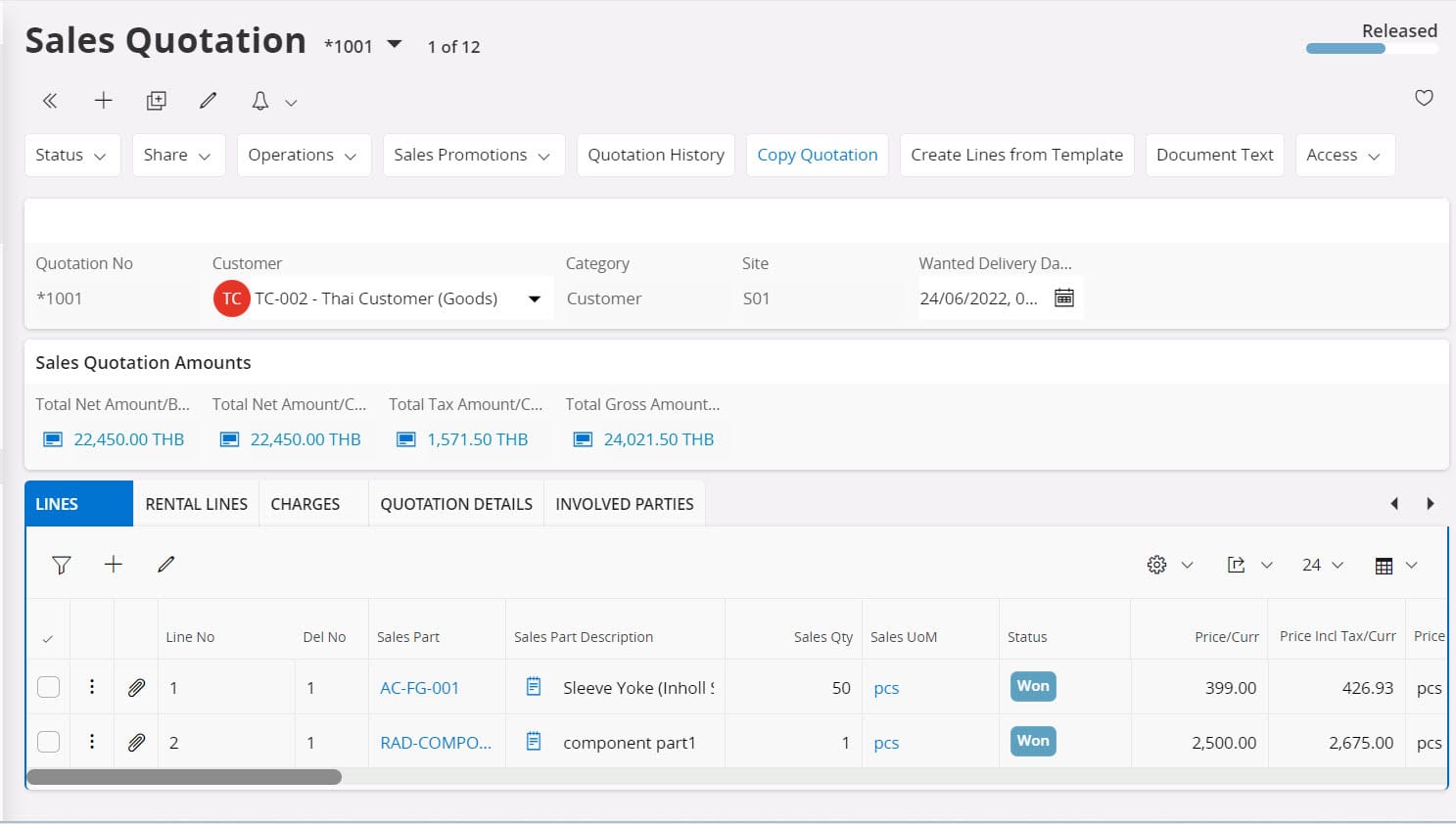 Customer Order ถือว่าเป็นต้นทางของห่วงโซ่อุปทานที่จะนำส่งสินค้าและบริการไปถึงมือลูกค้า โดยระบบจัดการคำสั่งขาย Customer Order เริ่มการเปิดใบเสนอราคา (Sales Quotation) เพื่อทำเสนอสินค้าและบริการแก่ลูกค้า โดยจะมีรายละเอียดไม่ว่าเป็นรหัสสินค้า ชื่อสินค้า จำนวนขาย ราคาขาย สถานะของใบเสนอราคา วัน และสถานที่ส่งมอบ เป็นต้น