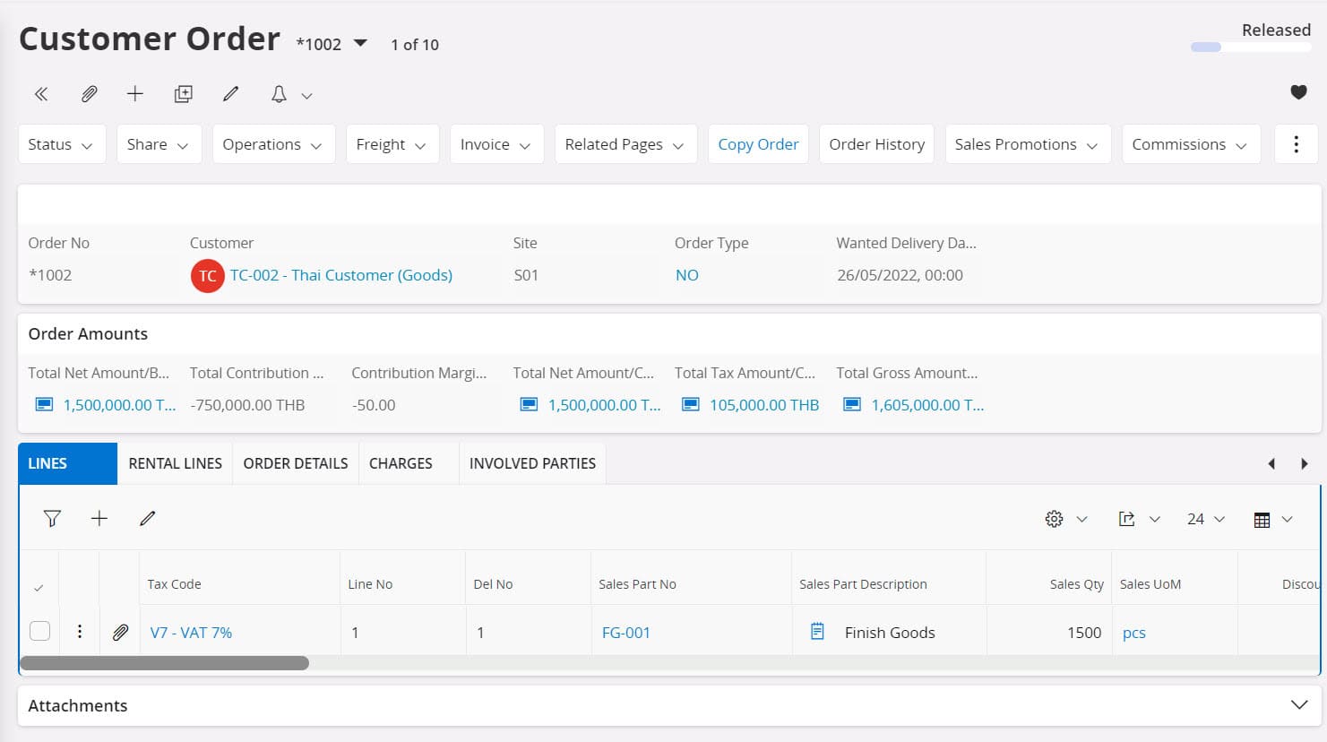 เมื่อลูกค้าตอบรับใบเสนอราคา ระบบสามารถเปลี่ยนใบเสนอราคาให้กลายเป็นใบสั่งขาย (Customer Order) ได้อย่างรวดเร็ว ลดปัญหาข้อผิดพลาดระหว่างใบเสนอราคาและใบสั่งขาย โดยใบสั่งขายจะเริ่มทำการจองสินค้า (Reserve) ที่มีอยู่แล้วในคลังสินค้า หรือสั่งผลิต (Shop order) เพื่อเตรียมนำส่งสินค้า สถานะของ Customer Order จะเปลี่ยนไปตามขั้นตอนการขายที่ได้ออกแบบไว้ ยกตัวอย่างสถานะ เช่น Released (ยืนยันแล้ว), Picked (หยิบของแล้ว) และ Delivered (ส่งสินค้าแล้ว) สุดท้ายคือการออกใบแจ้งหนี้ (Invoiced/Closed) พร้อมนำส่งสินค้า และส่งข้อมูลต่อไปยังระบบบัญชีลูกหนี้เพื่อทำการรอรับชำระค่าสินค้า