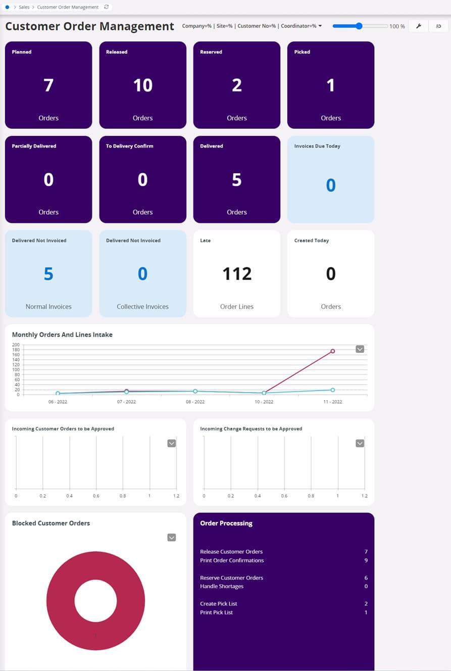หน้าจอ Customer Order Management ซึ่งจะรวบรวมข้อมูล Customer Order แยกตาม Site หรือ ตามบริษัท ทำให้ผู้บริหารมองเห็นภาพรวมของใบสั่งขายตามสถานะต่างๆของใบสั่งขาย