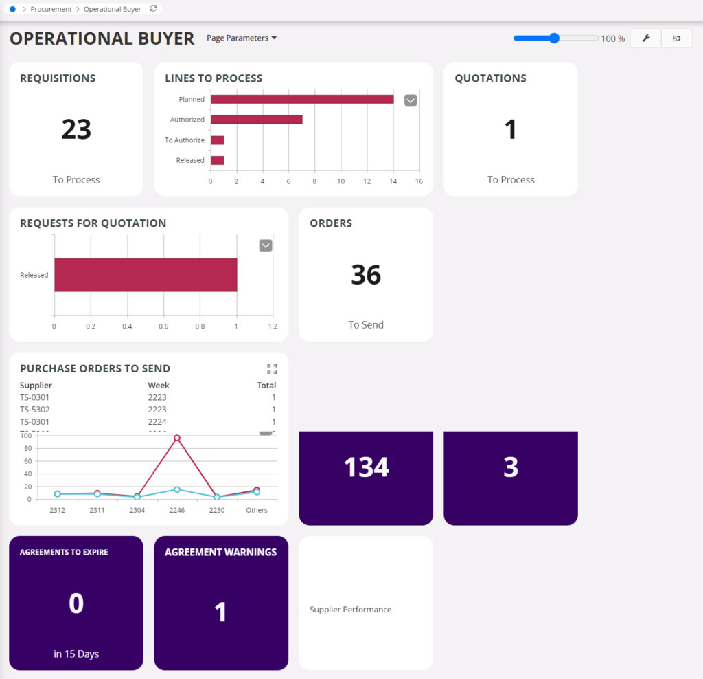 Purchasing Dashboard ทูลที่ช่วยในการวิเคราะห์การทำงานของแผนกจัดซื้อ จัดทำในรูปแบบของกราฟ ทำให้เข้าใจง่าย และสามารถเข้าถึงข้อมูลโดยการคลิ๊กที่ตัวเลขเท่านั้น ซึ่งระบบ Purchasing ของ IFS นั้นก็มี Dashboard หลายๆตัว ที่ช่วยในการวิเคราะห์ ยกตัวอย่างเช่น